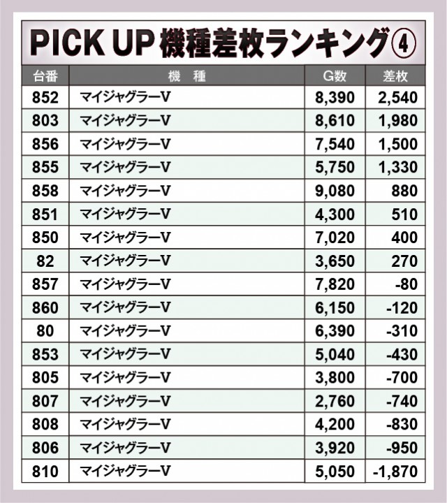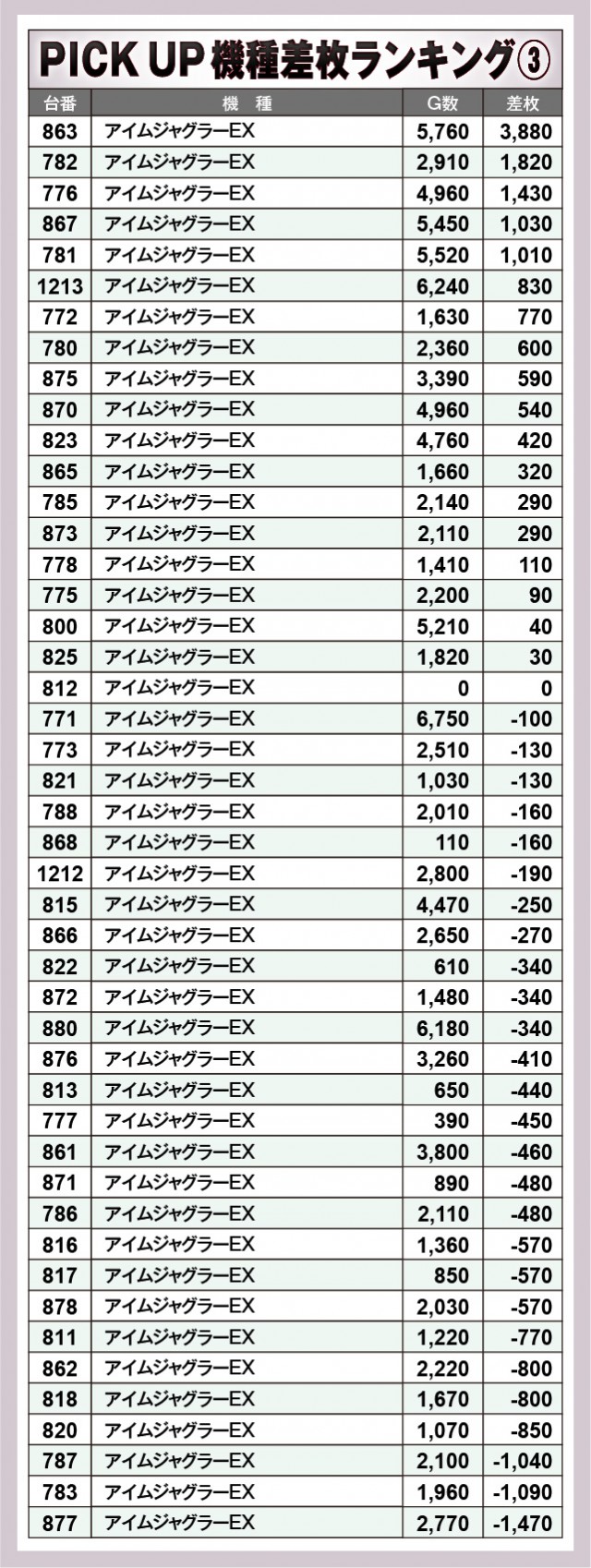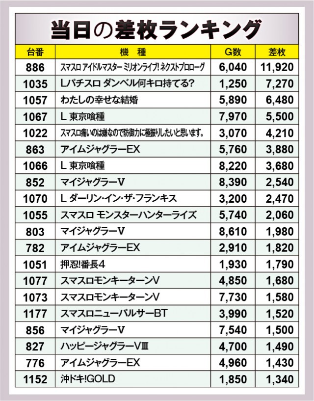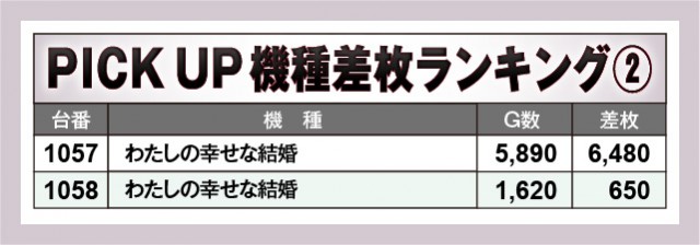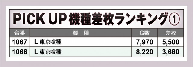 『L 東京喰種』『わたしの幸せな結婚』から大台突破を確認できるだけでなく、両機種とも全台プラス差枚数を達成していたのが鮮烈であるばかり。AT機らしく熱気面で盛り上がりをリードする様子は、目を奪われる存在だったと言える。そして『アイムジャグラーEX』『マイジャグラーⅤ』もコンスタントに大当りを積み重ねていた。特に後者は高い活気でファンを魅了しており、こちらも見逃せない機種となっていた様子だ。