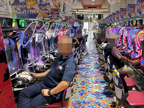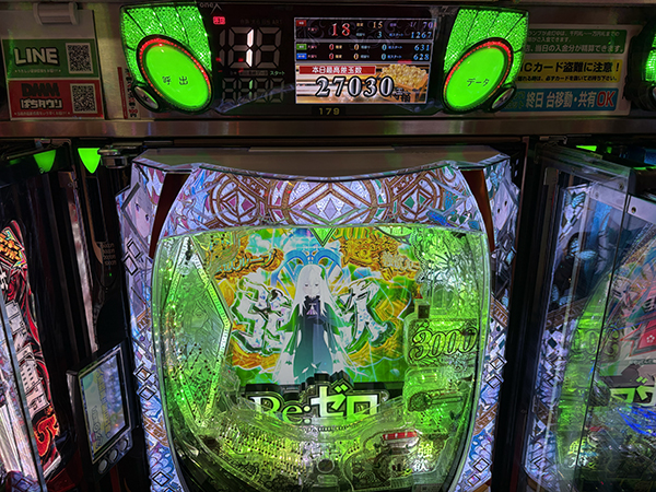 15時半ごろの4円パチンコを見てみると「Pスーパー海物語 IN 沖縄5」や「P魔法少女まどか☆マギカ3」、「e Re:ゼロから始める異世界生活 season2」が盛況の様子。機種のポテンシャルを上手く発揮するプレイヤーを確認している。