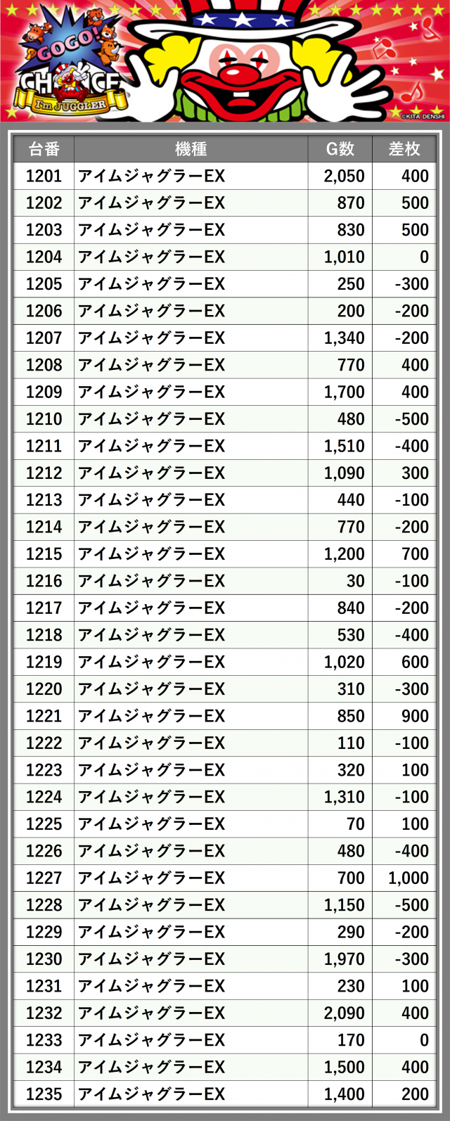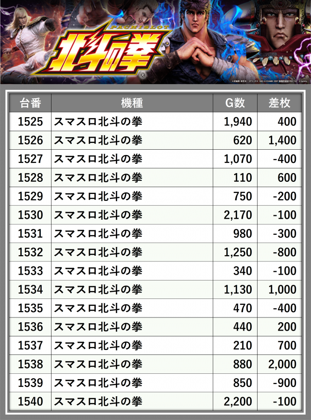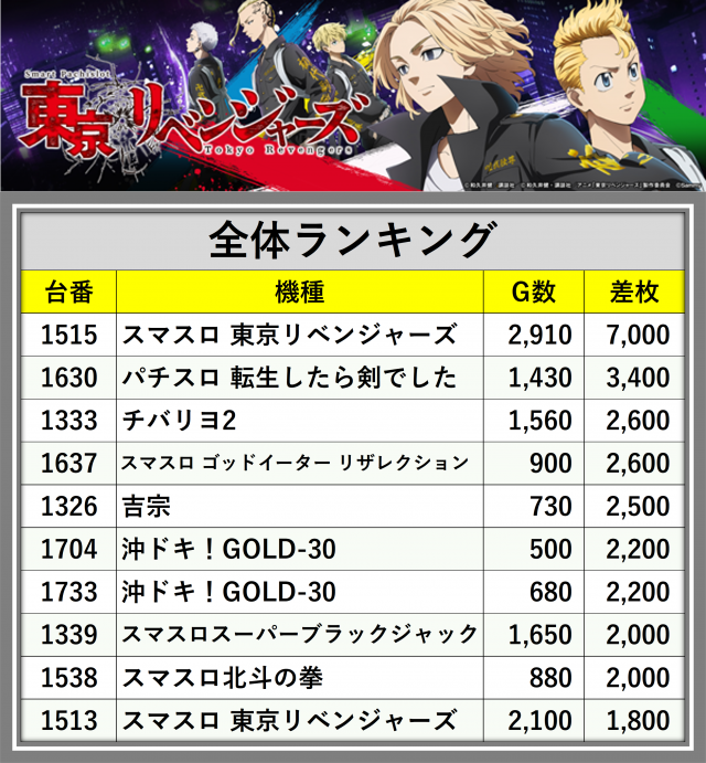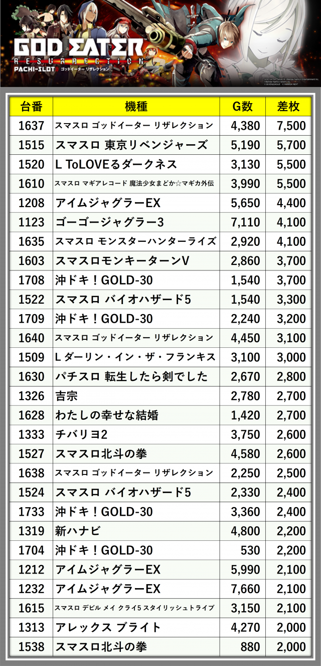 厳選された取材対象機種をはじめ、その他スロット全体から好記録が飛び出した!プレイヤーが楽しんだ1日を下記データにて振り返ってみて欲しい。