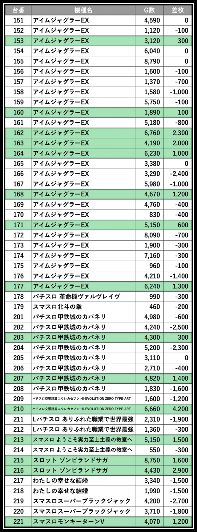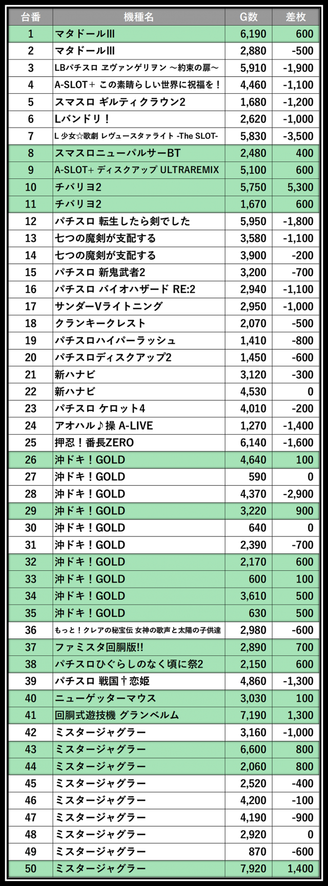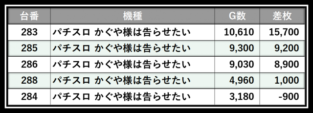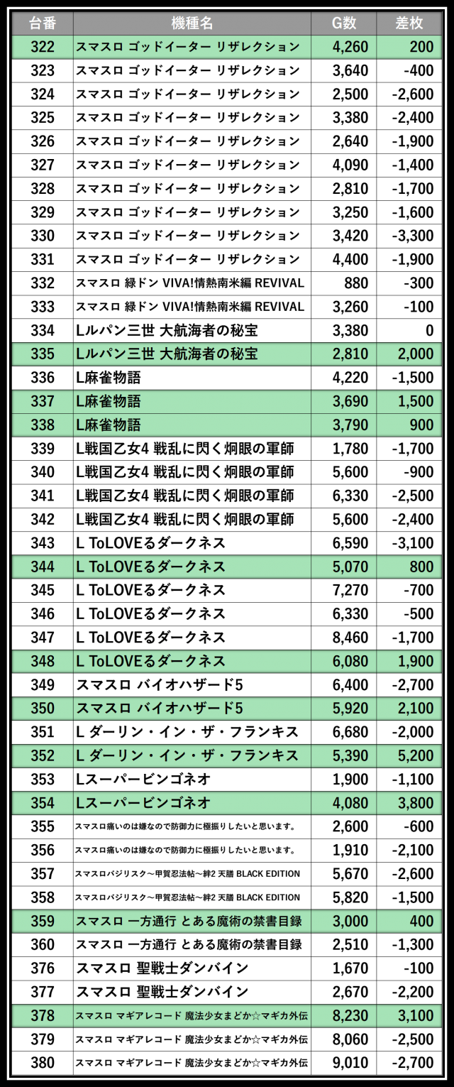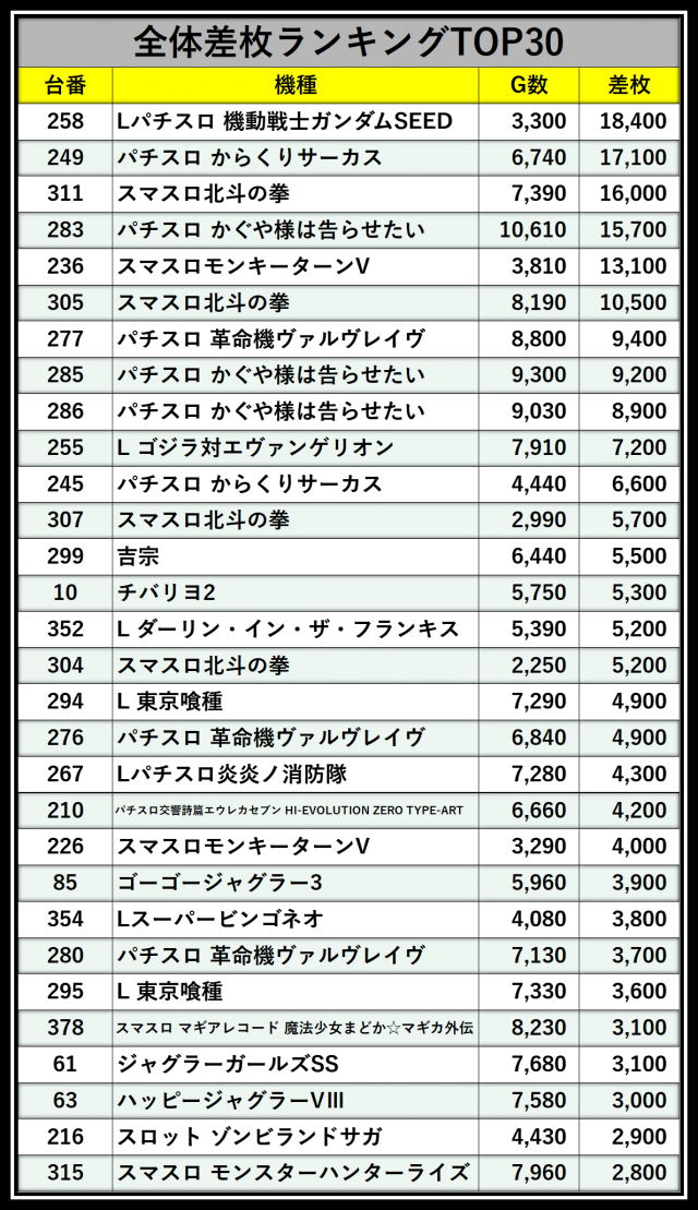 ※差枚数順に掲載しています