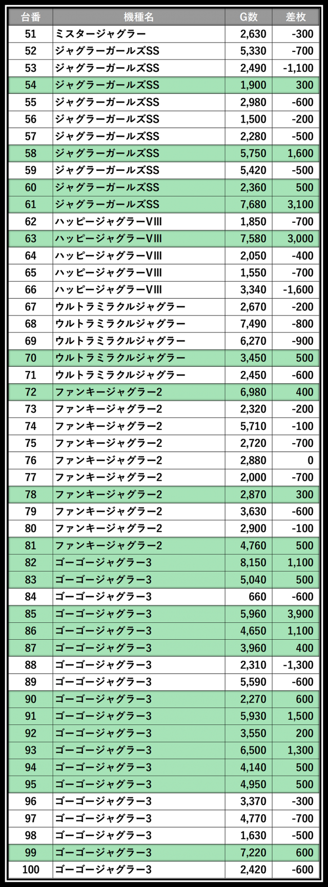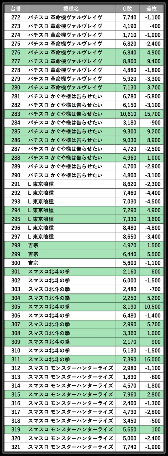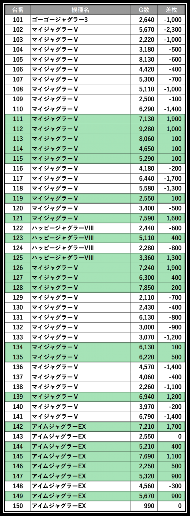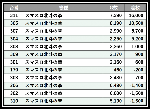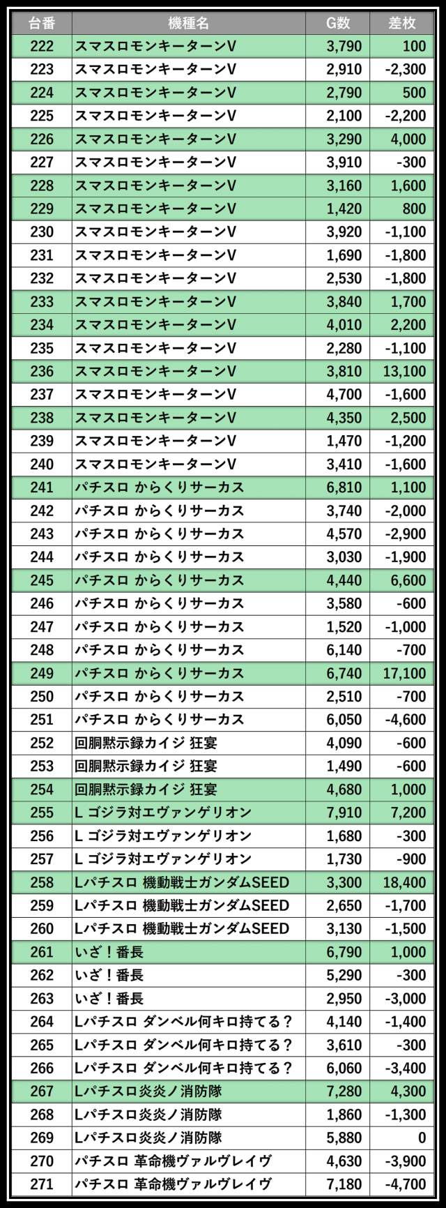 ※差枚数順に掲載しています