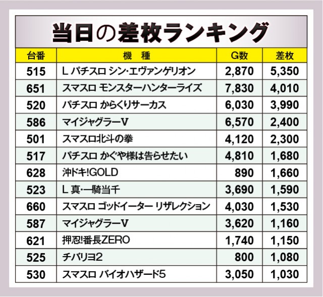 『パチスロ からくりサーカス』『スマスロ モンスターハンターライズ』は今なおファンからの支持を集めており、高い活気と熱気で店内の盛り上がりをリード。『L パチスロ シン・エヴァンゲリオン』も大台突破で存在感を示しており、ファンはレバーを叩きながら高揚感を抑えきれなかったことだろう。そして『マイジャグラーⅤ』もノーマル機を代表する存在で、回転数と差枚数が比例する展開を披露していたのも見逃せないポイントだ。