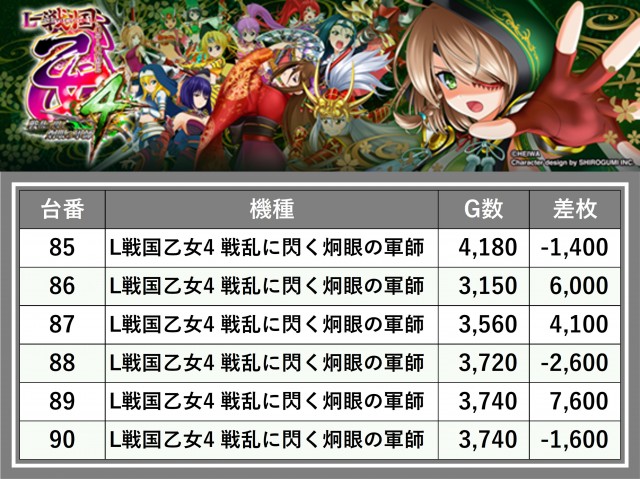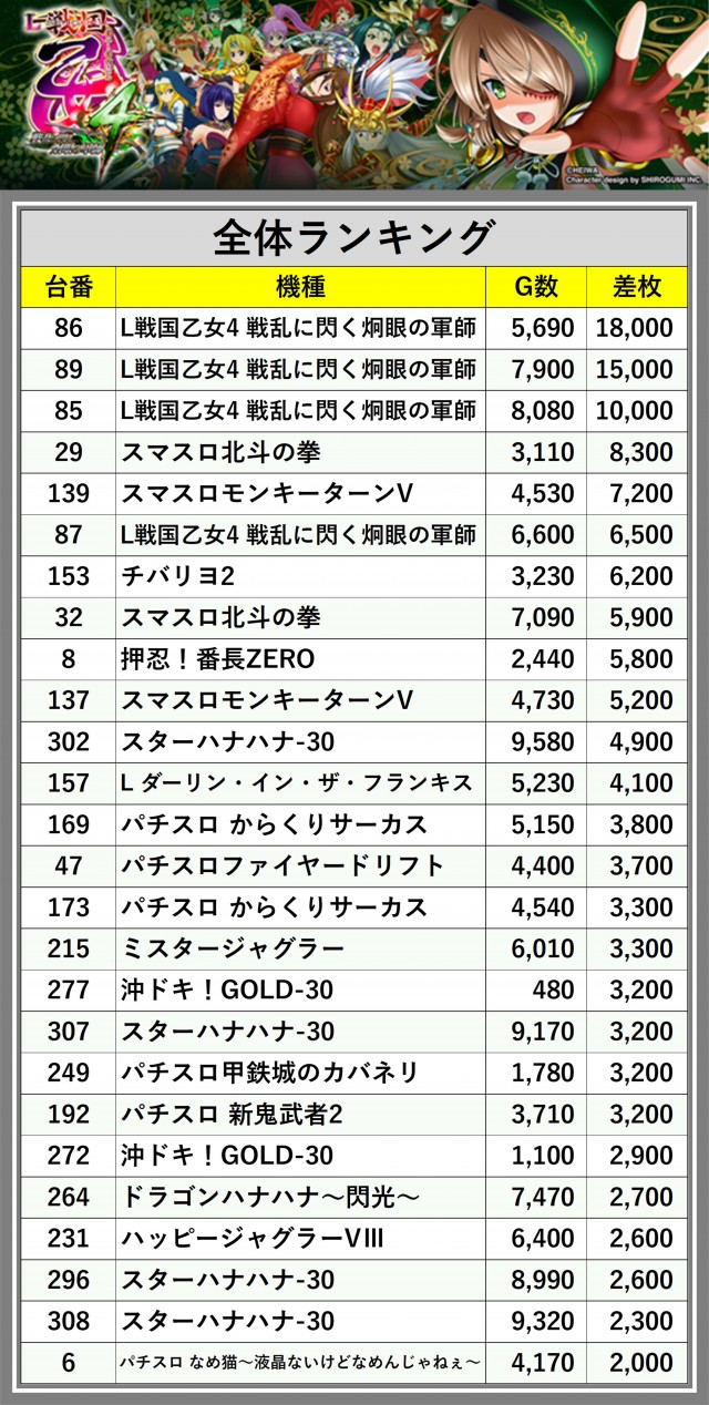 厳選された取材対象機種をはじめ、その他スロット全体から好記録が飛び出した!プレイヤーが楽しんだ1日を下記データにて振り返ってみて欲しい。