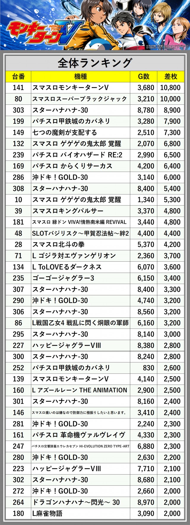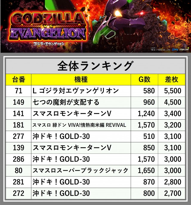 厳選された取材対象機種をはじめ、その他スロット全体から好記録が飛び出した!プレイヤーが楽しんだ1日を下記データにて振り返ってみて欲しい。