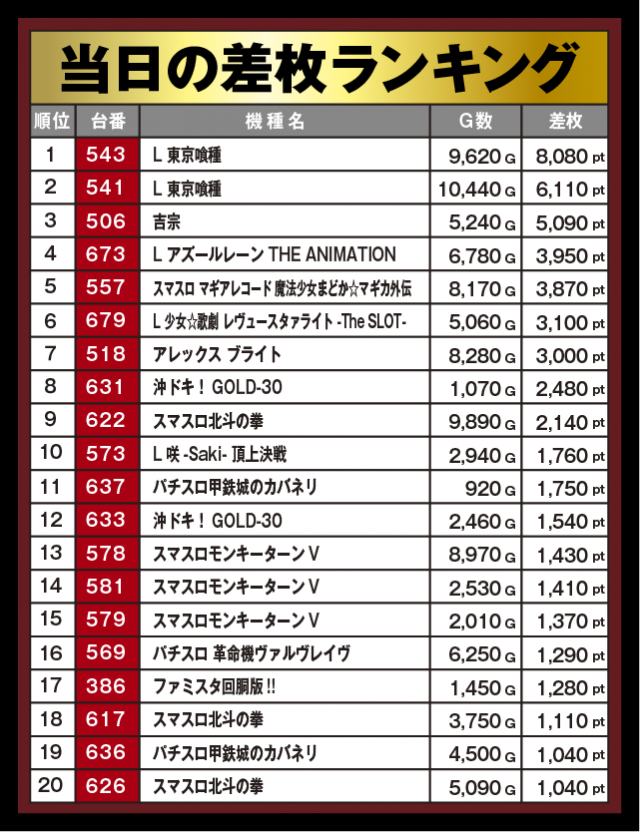 この日のSAPグループはひと味違う。DMMぱちタウンは、「SAP野田」の特別なひとときを一斉取材した。特に華々しい活躍を残した機種たちをピックアップして紹介しよう。まずは差枚ランキングの発表だ!
