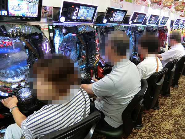 15時を過ぎたころの4円パチンコを見ると、「CR牙狼GOLDSTORM翔」や新台の「CRぱちんこ魔法少女まどか☆マギカ」を筆頭に盛況。空き台が見当たらないほどの高稼働となっており、シマ全体がプレイヤーの熱気に包まれていた。