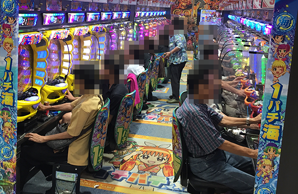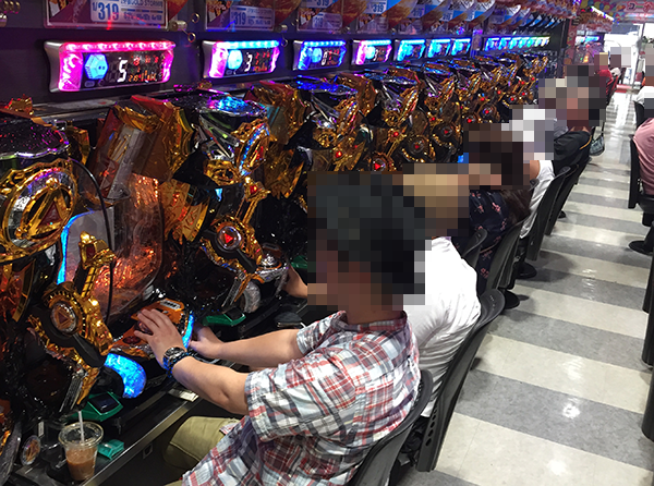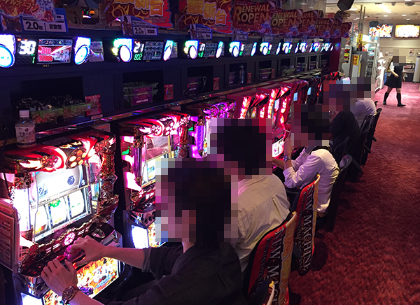大勢のプレイヤーが活躍をみせる5円パチスロのにぎわいも大きく、明るい雰囲気がパチスロコーナー全体を包みこんでいた。