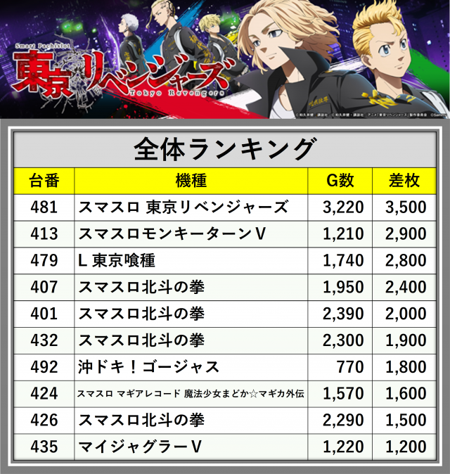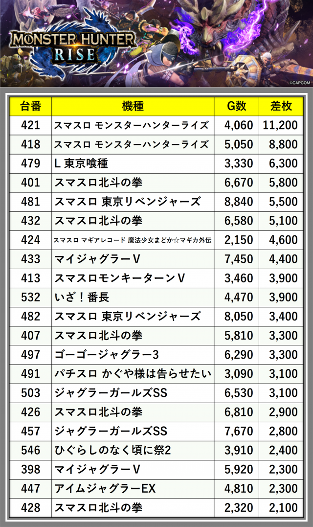 厳選された取材対象機種をはじめ、その他スロット全体から好記録が飛び出した!プレイヤーが楽しんだ1日を下記データにて振り返ってみて欲しい。