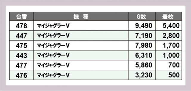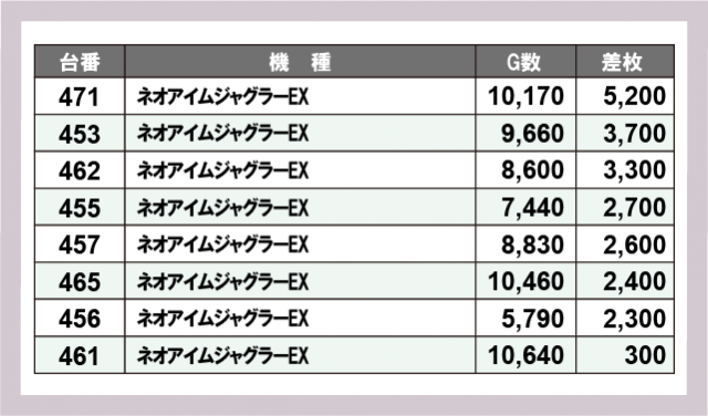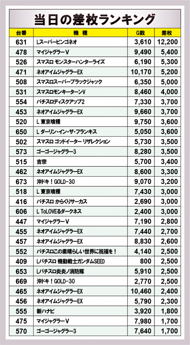 ※差枚数順に掲載しています