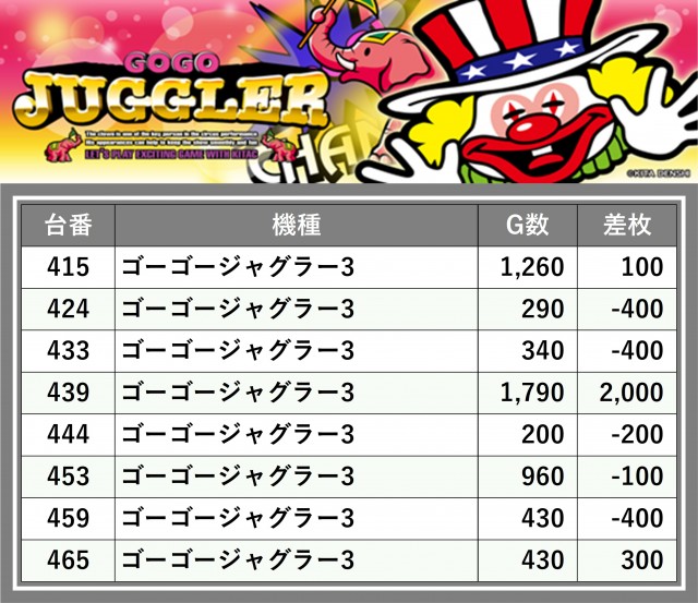 厳選された取材対象機種をはじめ、その他スロット全体から好記録が飛び出した!プレイヤーが楽しんだ1日を下記データにて振り返ってみて欲しい。