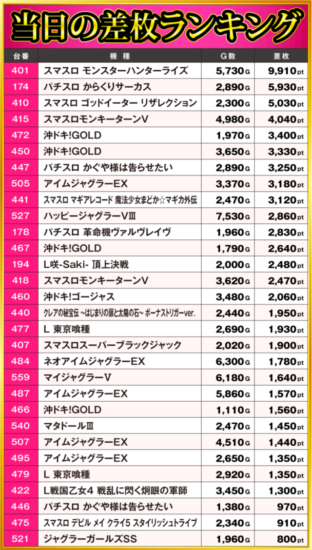 この日、最もプレイヤーの注目を集めたのが『スマスロ モンスターハンターライズ』で、401番台が万枚目前の+9,910ptを叩き出しランキングトップに。次いで『パチスロ からくりサーカス』と『スマスロ ゴッドイーター リザレクション』が+5,000pt超を記録するなど、人気のスマスロを中心に多数のハイスコアが発生している。