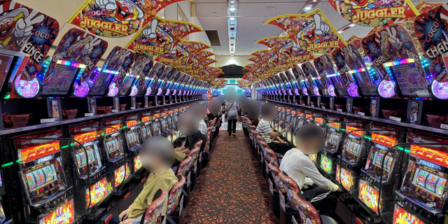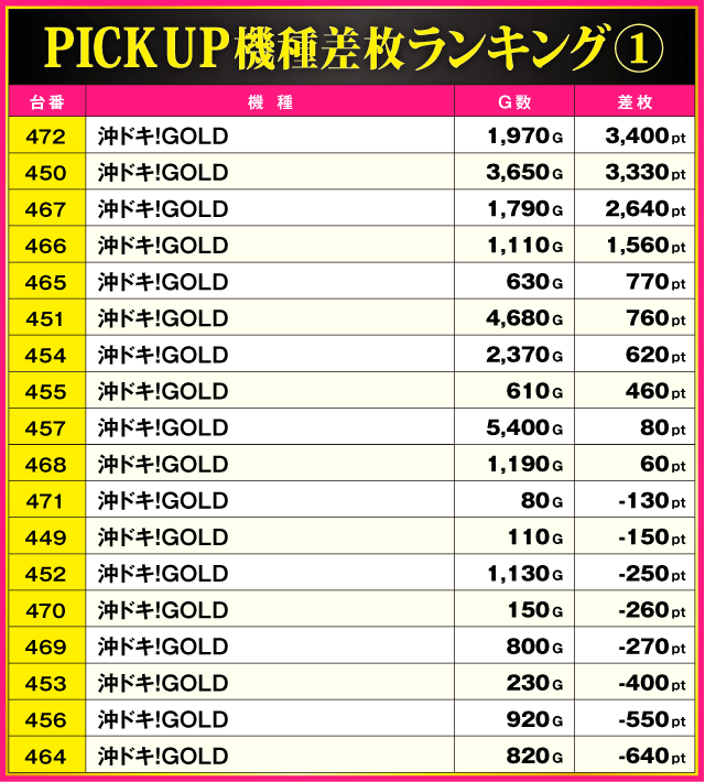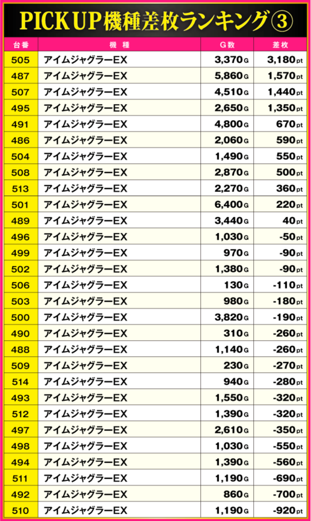 次にPICK UP機種の状況をチェックしていくと、ハイスコアを記録した『スマスロ モンスターハンターライズ』以外からも多数の好調台を確認。『沖ドキ!GOLD』からは+3,000pt超が2台、『アイムジャグラーEX』は+3,180枚を筆頭にプラス差枚台が続出しているだけに、それぞれのシマは常に活気に満ち溢れる一日となった。