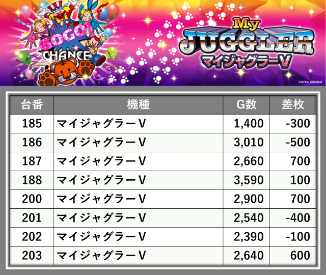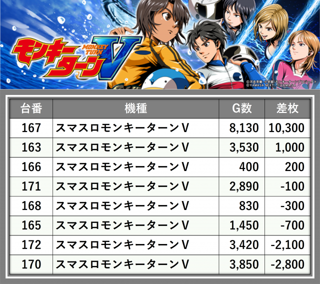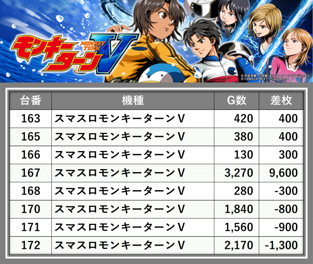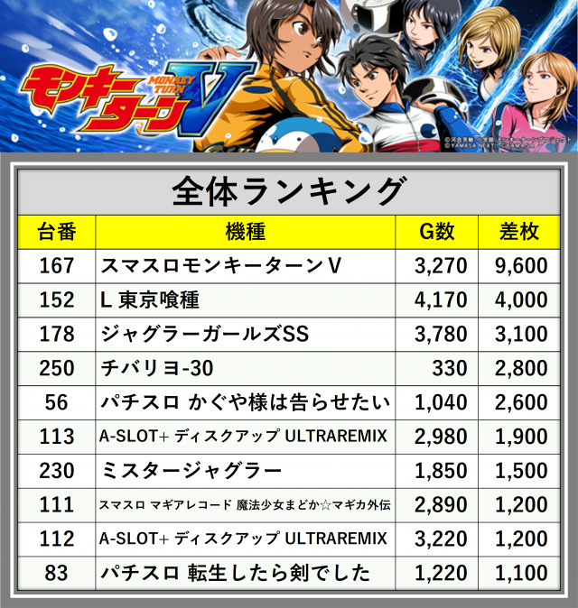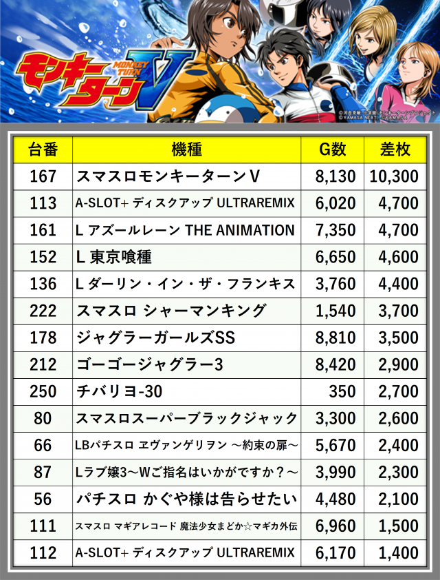 厳選された取材対象機種をはじめ、その他スロット全体から好記録が飛び出した!プレイヤーが楽しんだ1日を下記データにて振り返ってみて欲しい。