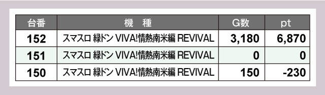 『L 東京喰種』142番台が+8,050pt、『パチスロ かぐや様は告らせたい』242番台が+7,770ptと素晴らしい成績を残している。そして『スマスロ 緑ドン VIVA!情熱南米編 REVIVAL』152番台が+6,870ptと、こちらも優秀な結果を残した。ほかにも『スマスロ ゴッドイーター リザレクション』257番台の+6,160ptなどなど、大幅プラスptの優秀台が多数誕生したようだ。
