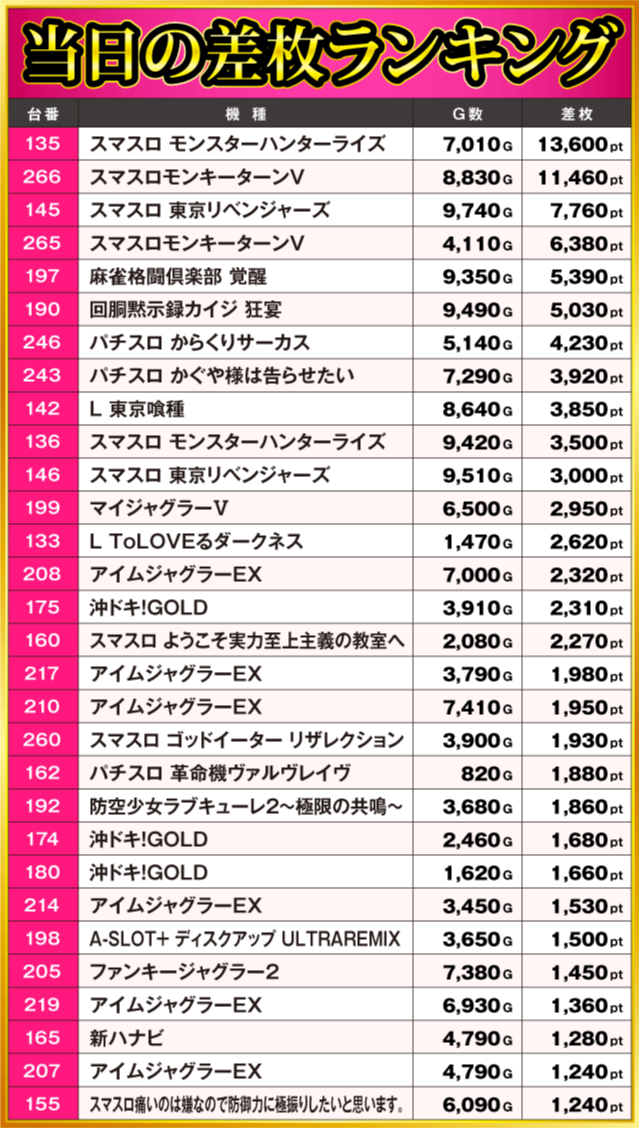この日は、『スマスロ モンスターハンターライズ』が+13,600pt、『スマスロモンキーターンV』が+11,460ptと、人気機種から万枚超が連発。さらに、導入直後の新台『スマスロ 東京リベンジャーズ』が+7,760ptを記録するなど、新旧を問わず様々な機種でハイスコアが確認されている。