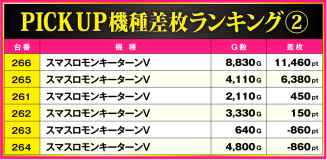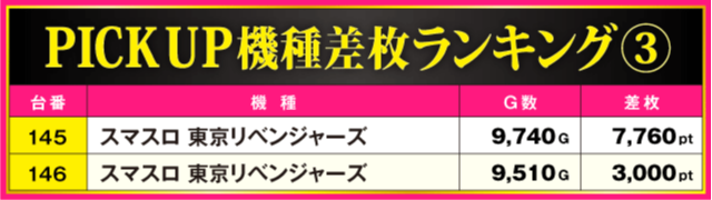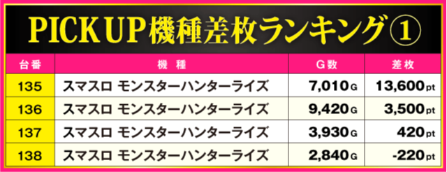 今回のPICK UP機種は差枚上位にランクインした3機種。ハイスコアが飛び出しただけでなく、3機種トータルの全12台中9台がプラス差枚で実戦を終える見事な結果を残しているだけに、ファンにとって充実の一日となったのは間違いないだろう。