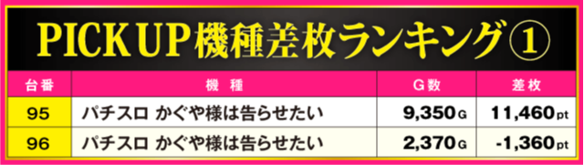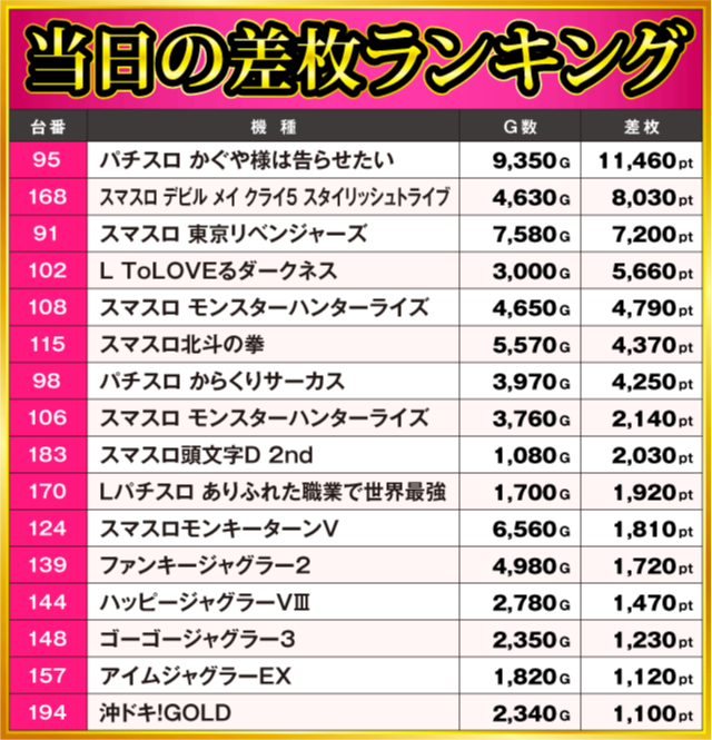 この日は、『パチスロ かぐや様は告らせたい』が万枚超の+11,460ptを叩き出しランキングトップに。次いで『スマスロ デビル メイ クライ5 スタイリッシュトライブ』から+8,030pt、さらに、導入直後の新台『スマスロ 東京リベンジャーズ』から+7,200ptが飛び出すなど、新旧を問わず様々な機種からハイスコアが発生している。