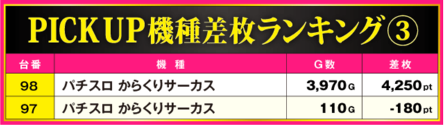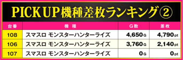 今回のPICK UP機種は全3機種で、ランキングを制した『パチスロ かぐや様は告らせたい』以外からも多数の好調台を確認。『スマスロ モンスターハンターライズ』からは+4,790pt、『パチスロ からくりサーカス』からは+4,250ptが発生しているだけに、それぞれのシマは常にファンの笑顔と活気に満ち溢れていた。