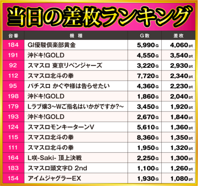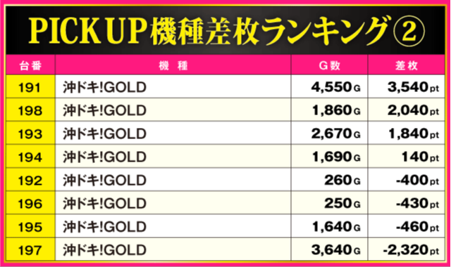 この日は、『GI優駿倶楽部黄金』が+4,060ptを叩き出しランキングトップに。次いで『沖ドキ!GOLD』から+3,540pt、さらには様々な機種から+2,000pt超が多数確認されており、設置台数や新旧を問わず広範囲に渡ってチャンスが潜んでいたのは間違いないだろう。
