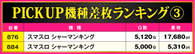 今回のPICK UP機種は差枚上位にランクインした3機種。ハイスコアが飛び出しただけでなく、3機種トータルの全22台中15台がプラス差枚で実戦を終える見事な結果を残しているだけに、ファンにとって充実の一日となったのは間違いないだろう。