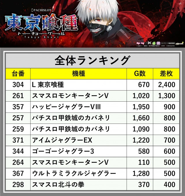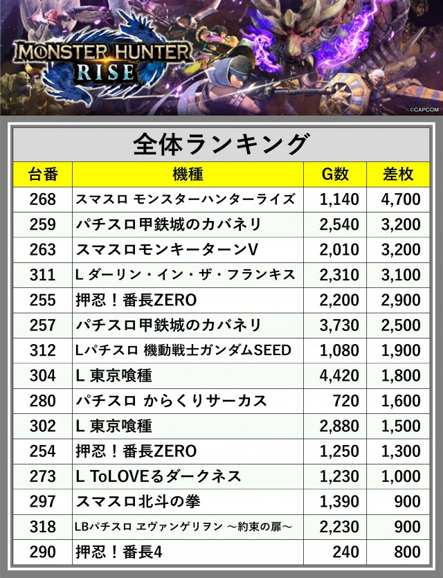 ※差枚数順に掲載しています