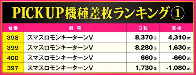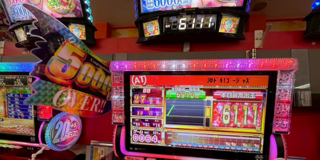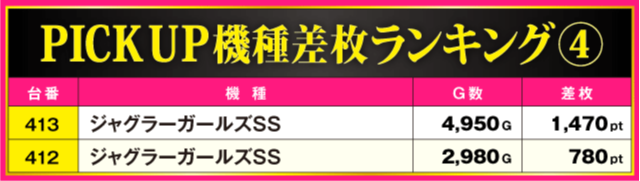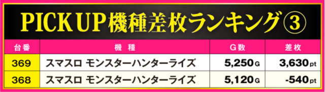 今回のPICK UP機種は全4機種で、ハイスコアを記録した『パチスロ 転生したら剣でした』と『スマスロモンキーターンV』以外以外にも『スマスロ モンスターハンターライズ』から+3,630ptといった好成績が発生。さらに『ジャグラーガールズSS』は設置されている2台がともにプラス差枚となる見事な結果を残しているだけに、それぞれのシマは常に活気に満ち溢れる一日となった。