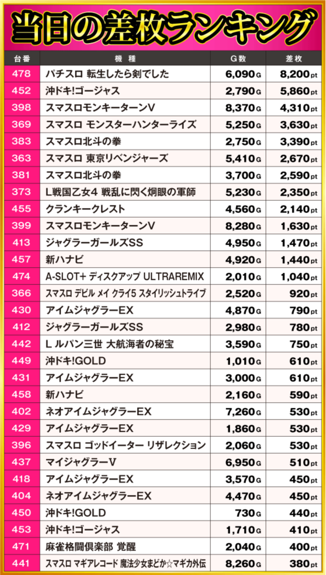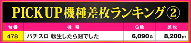 この日、最もプレイヤーの注目を集めたのが『パチスロ 転生したら剣でした』で、478番台が+8,200ptを叩き出しランキングトップに。また、その他にも『沖ドキ!ゴージャス』から+5,860pt、『スマスロモンキーターンV』から+4,310ptが飛び出すなど、人気機種を中心に多数の好成績が確認されている。