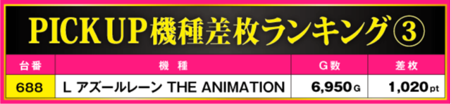 次にPICK UP機種の状況をチェック!! ハイスコアが飛び出した『L 東京喰種』と『スマスロ 東京リベンジャーズ』は、最終的に半数の台がプラス差枚で実戦を終える見事な結果に。また、『L アズールレーン THE ANIMATION』からも+1,020ptが発生しており、少台数機種にもしっかりとチャンスが潜んでいたのは間違いないだろう。