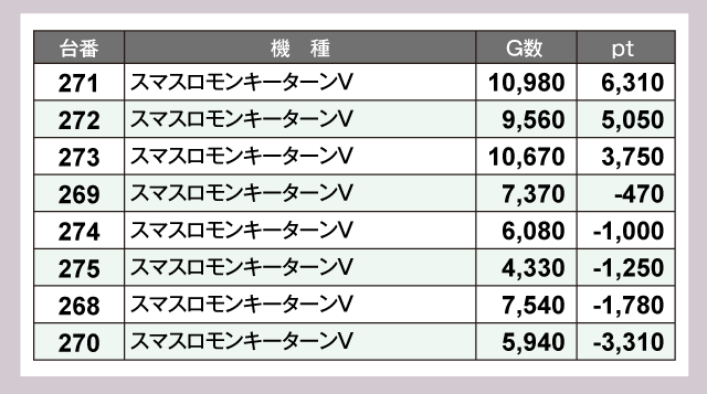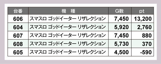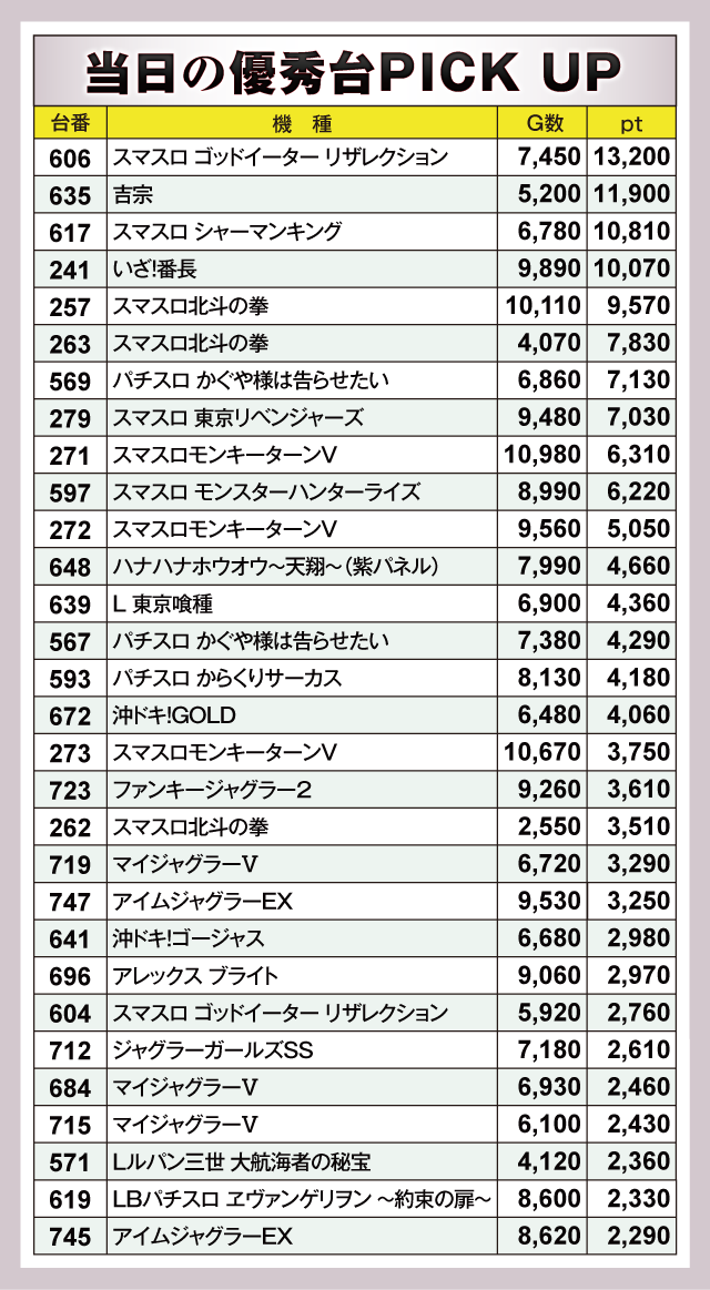 『スマスロ ゴッドイーター リザレクション』606番台が+13,200ptで、もっとも強い輝きを放っていた。そして『吉宗』635番台が+11,900pt、『スマスロ シャーマンキング』617番台が+10,810pt、『いざ!番長』241番台が+10,070ptとつづく。以上4台の1万ptオーバーのほかに、『スマスロ北斗の拳』257番台の+9,570ptなど、かなりの優秀台が多数誕生した盛大な1日となっていた。