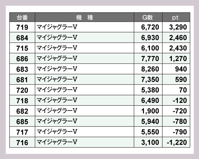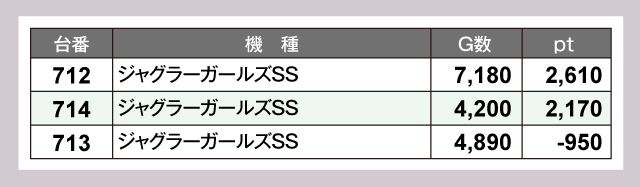 『ジャグラー』シリーズからは『マイジャグラーⅤ』と『ジャグラーガールズSS』をピックアップ。稼働が高めで、トータルptでも大きくプラスになっていた。