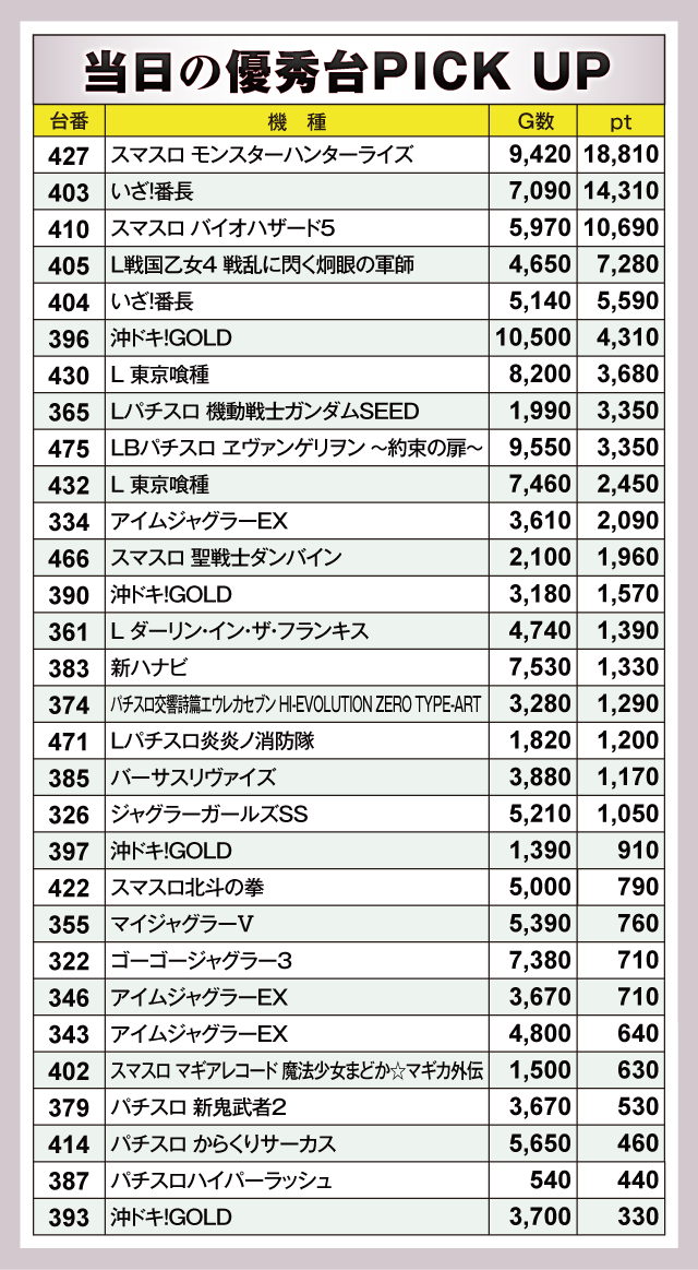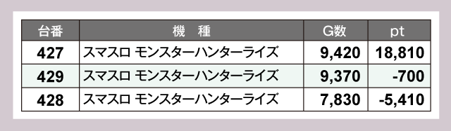 『スマスロ モンスターハンターライズ』427番台が+18,810ptと圧倒的な成績をおさめている。つづいて『いざ!番長』403番台が+14,310pt、『スマスロ バイオハザード5』410番台が+10,690ptと、計3台が1万ptオーバーを達成していた。さらに『L戦国乙女4 戦乱に閃く炯眼の軍師』405番台の+7,280pt、『いざ!番長』404番台の+5,590ptなどなど、超優秀台がひしめきあう見事なデータとなっている。