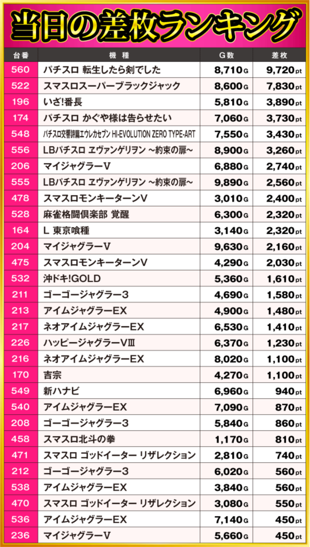 この日は、『パチスロ 転生したら剣でした』が万枚目前の+9,720ptを叩き出しランキングトップに。次いで『スマスロスーパーブラックジャック』から+7,830ptが飛び出すなど、人気のスマスロを中心にハイスコアが続出。また、ジャグラーシリーズも奮闘しており、最新作の『ネオアイムジャグラーEX』をはじめ複数の機種が差枚TOP30にランクインする盛況ぶりを見せている。