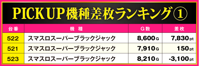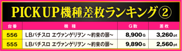 続いてPICK UP機種の状況を見ていこう。『スマスロスーパーブラックジャック』は522番台が+7,830ptを記録。さらに、『LBパチスロ ヱヴァンゲリヲン ~約束の扉~』は設置されている2台がともにプラス差枚で実戦を終える見事な結果を残しているだけに、両機種のシマは常に活気に満ち溢れる一日となった。