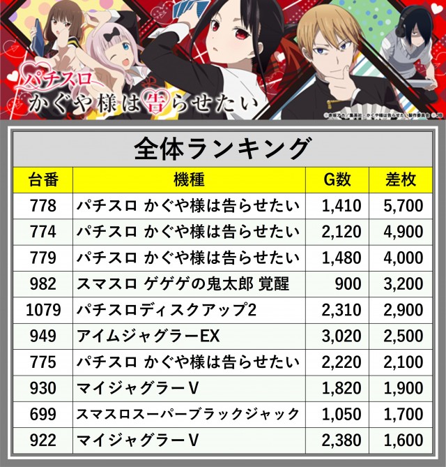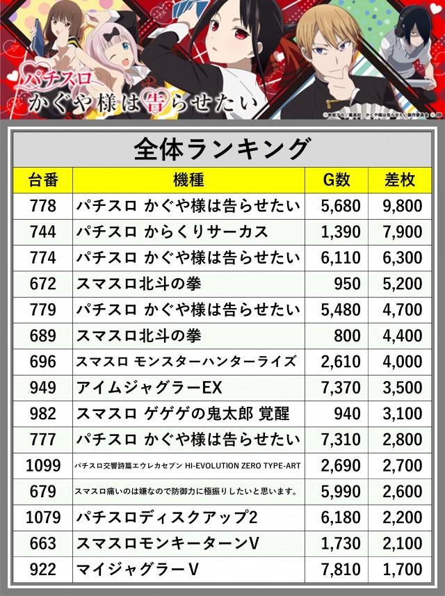※差枚数順に掲載しています