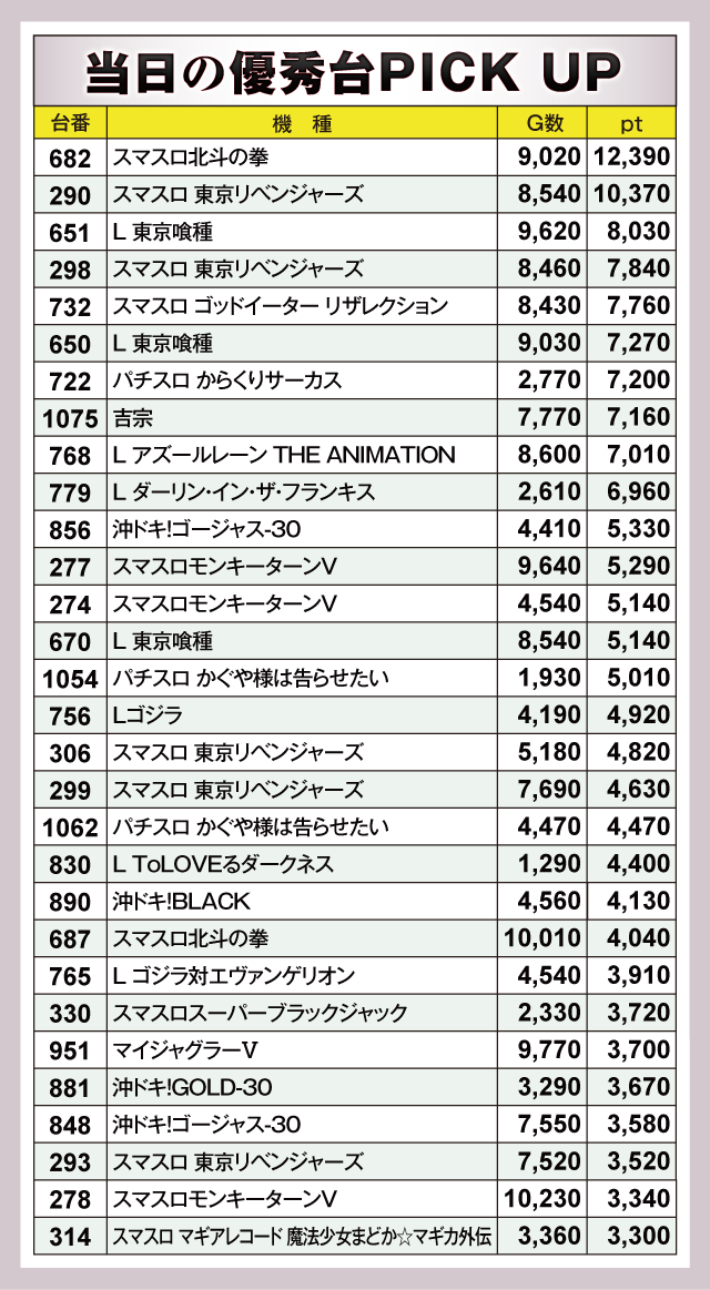 『スマスロ北斗の拳』682番台が+12,390pt、『スマスロ 東京リベンジャーズ』290番台が+10,370ptと、2台が1万ptオーバーの大活躍を見せてくれた。次点が『L 東京喰種』で、651番台が+8,030pt。さらに『スマスロ 東京リベンジャーズ』298番台の+7,840pt、『スマスロ ゴッドイーター リザレクション』732番台の+7,760ptなど7,000ptオーバーが6台並び、ほかにも超優秀台が多数誕生している。