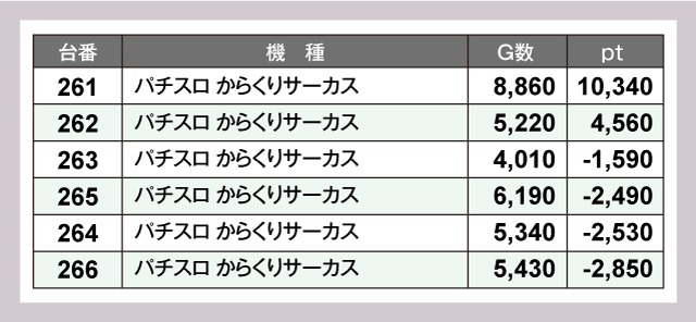 『パチスロ からくりサーカス』からも好成績だった台が散見された。最も回された261番台がとくに結果を出している。