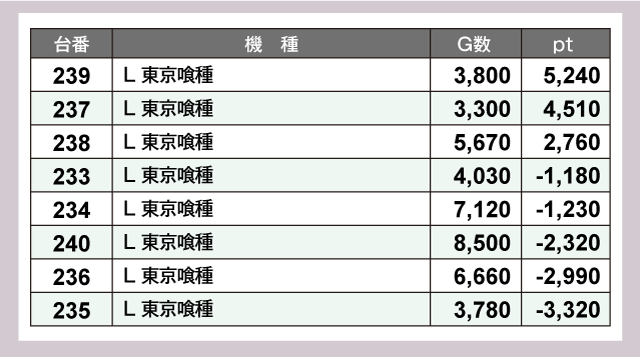 『L 東京喰種』は8台中3台が大幅なプラスptで、プレイヤーが夢中でレバーを叩いている姿が確認できた。