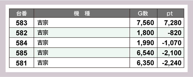 ひときわ目立っていたのは『パチスロ からくりサーカス』。261番台が+10,340ptと1万ptオーバーを達成していた。つづいて『スマスロモンキーターンV』561番台が+7,330pt、『吉宗』583番台が+7,280ptと並ぶ。そして『スマスロ アイドルマスター ミリオンライブ! ネクストプロローグ』789番台の+6,380pt、『スマスロ 一方通行 とある魔術の禁書目録』791番台の+6,340ptなど、様々な台がポテンシャルを発揮している。