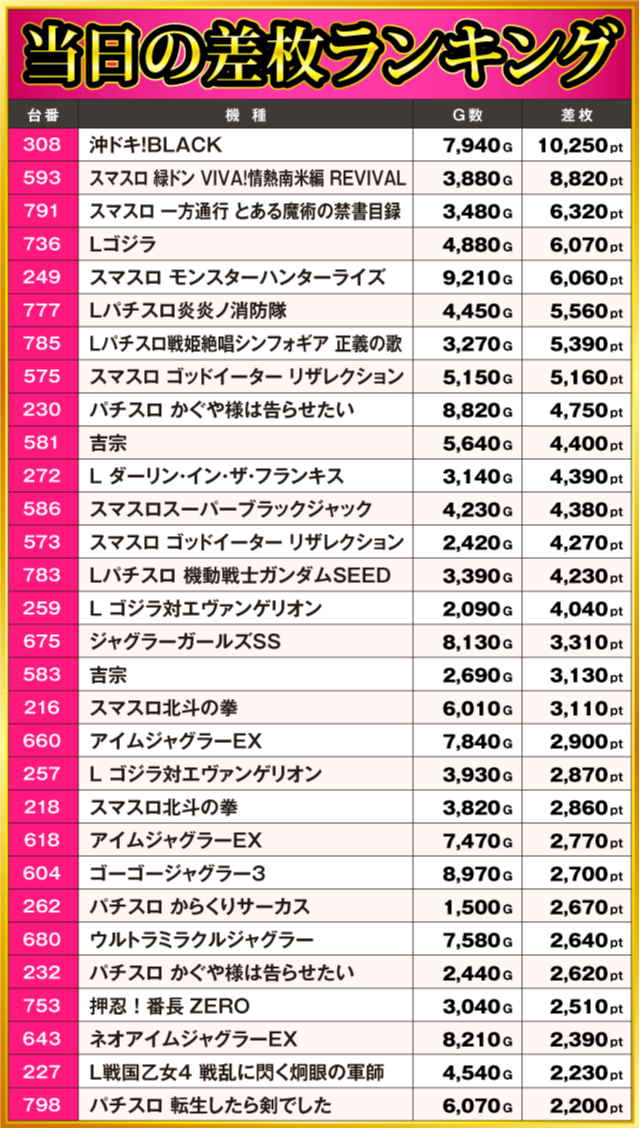 この日は、地域最大級の沖ドキ!シリーズをはじめ最新機種から人気機種まで、広範囲に渡って多数の好調台を確認。そんな中、『沖ドキ!BLACK』が万枚超の+10,250ptを叩き出しランキングトップに。次いで『スマスロ 緑ドン VIVA!情熱南米編 REVIVAL』が+8,820ptを記録している。