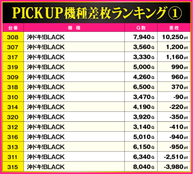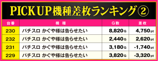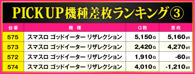 次にPICK UP機種の状況をチェック!! ランキングを制した『沖ドキ!BLACK』は半数近くの台がプラス差枚となる見事な結果に。また、『パチスロ かぐや様は告らせたい』からは+4,750pt、『スマスロ ゴッドイーター リザレクション』からは+5,160ptが飛び出しているだけに、それぞれのシマは常に活気に満ち溢れる一日となった。