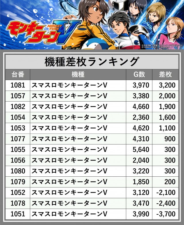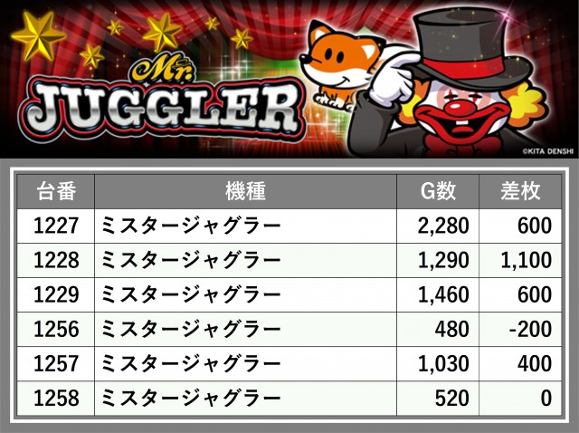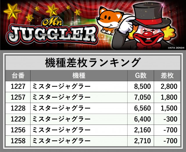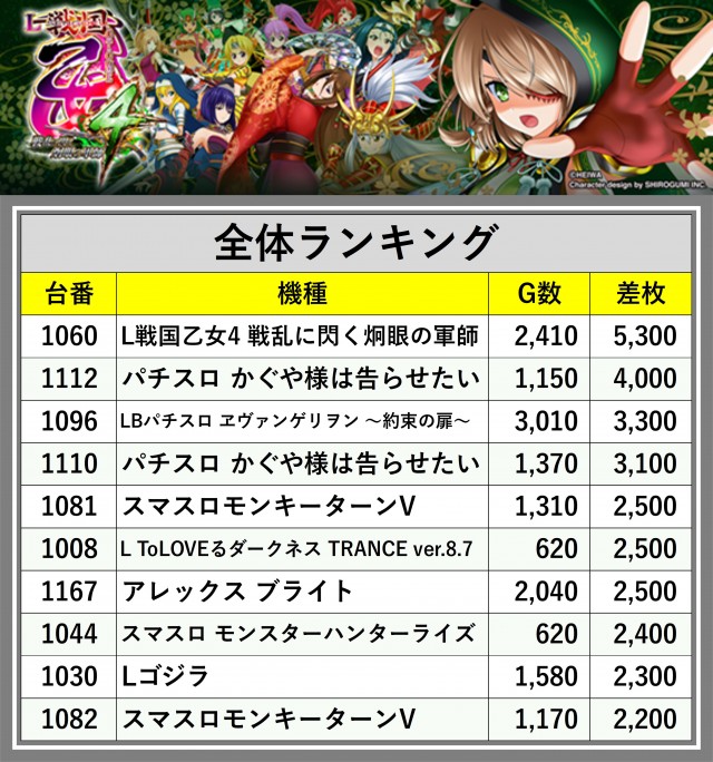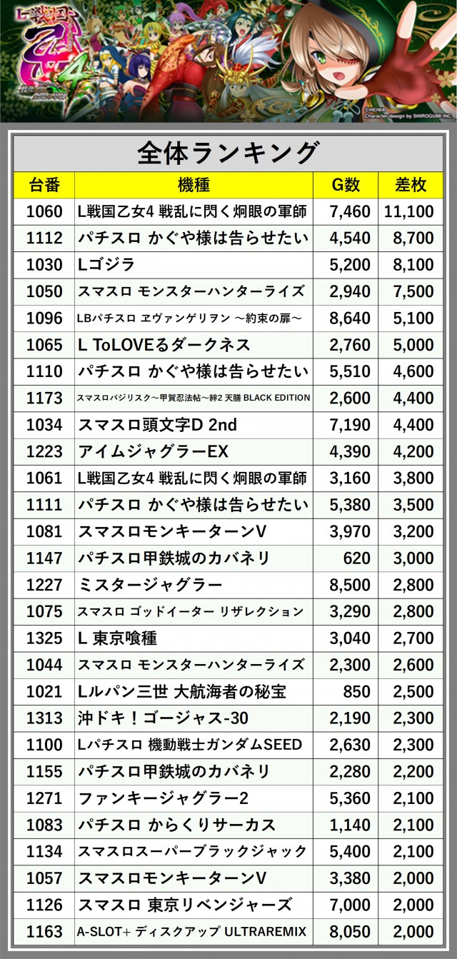 厳選された取材対象機種をはじめ、その他スロット全体から好記録が飛び出した!プレイヤーが楽しんだ1日を下記データにて振り返ってみて欲しい。