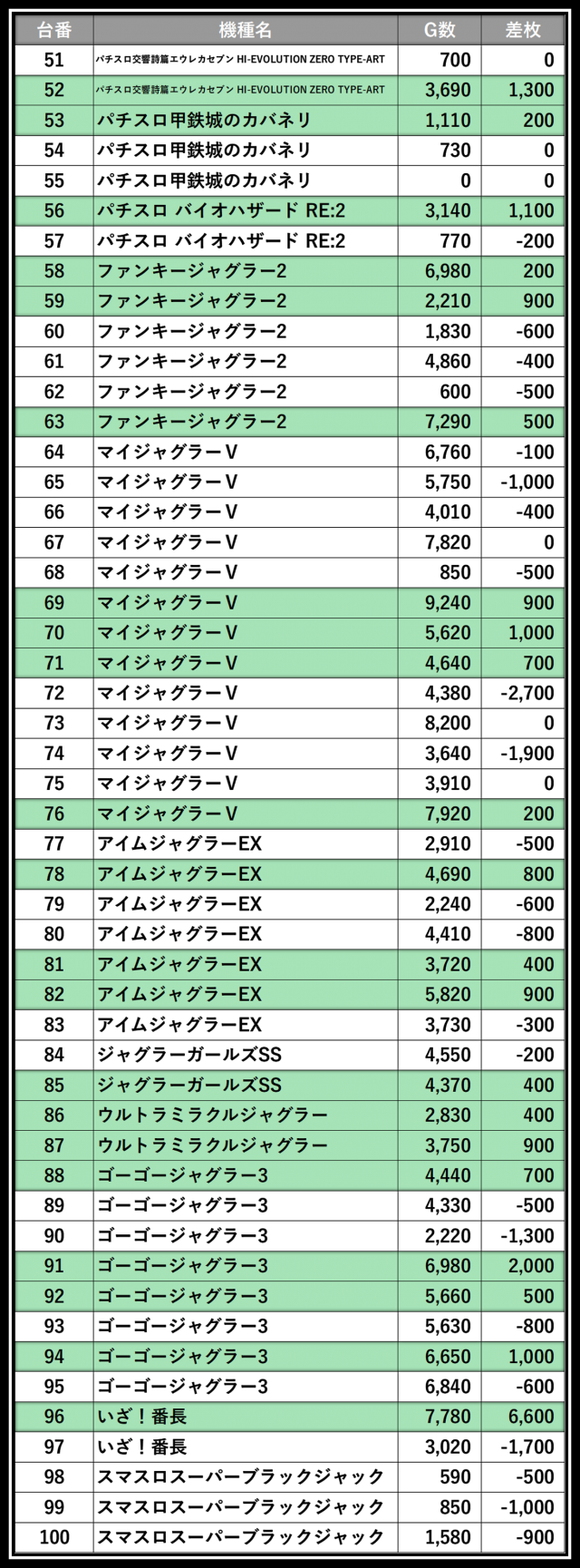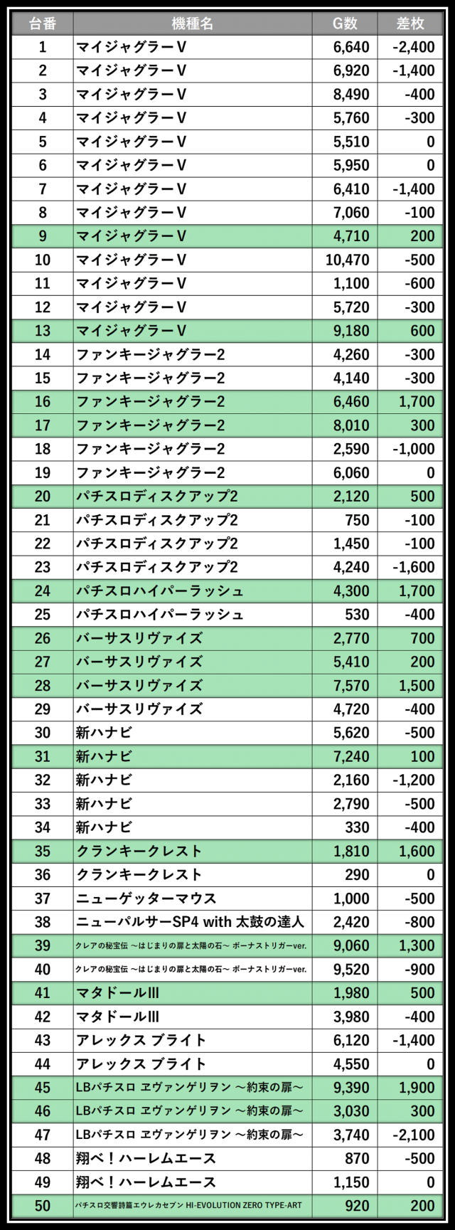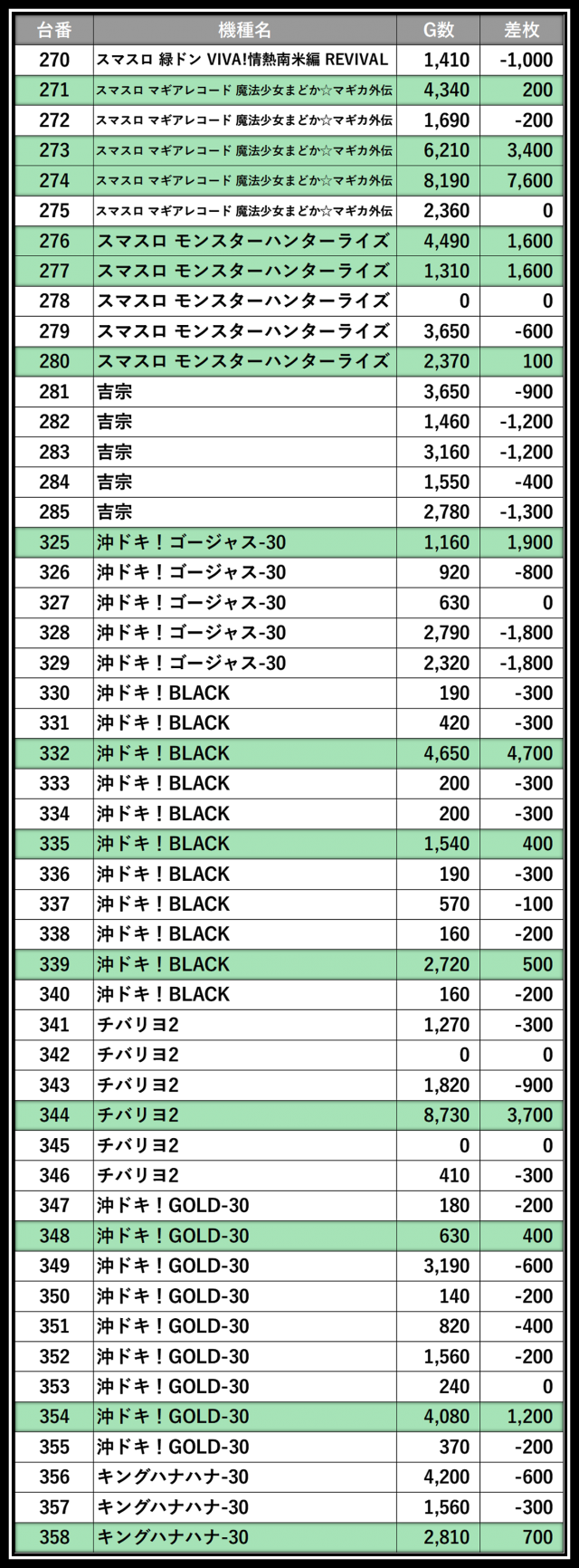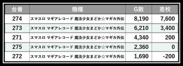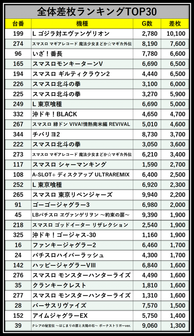 ※差枚数順に掲載しています