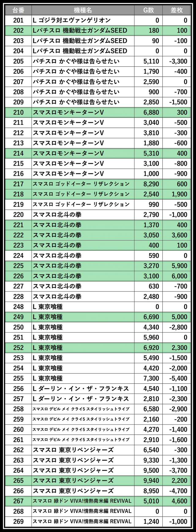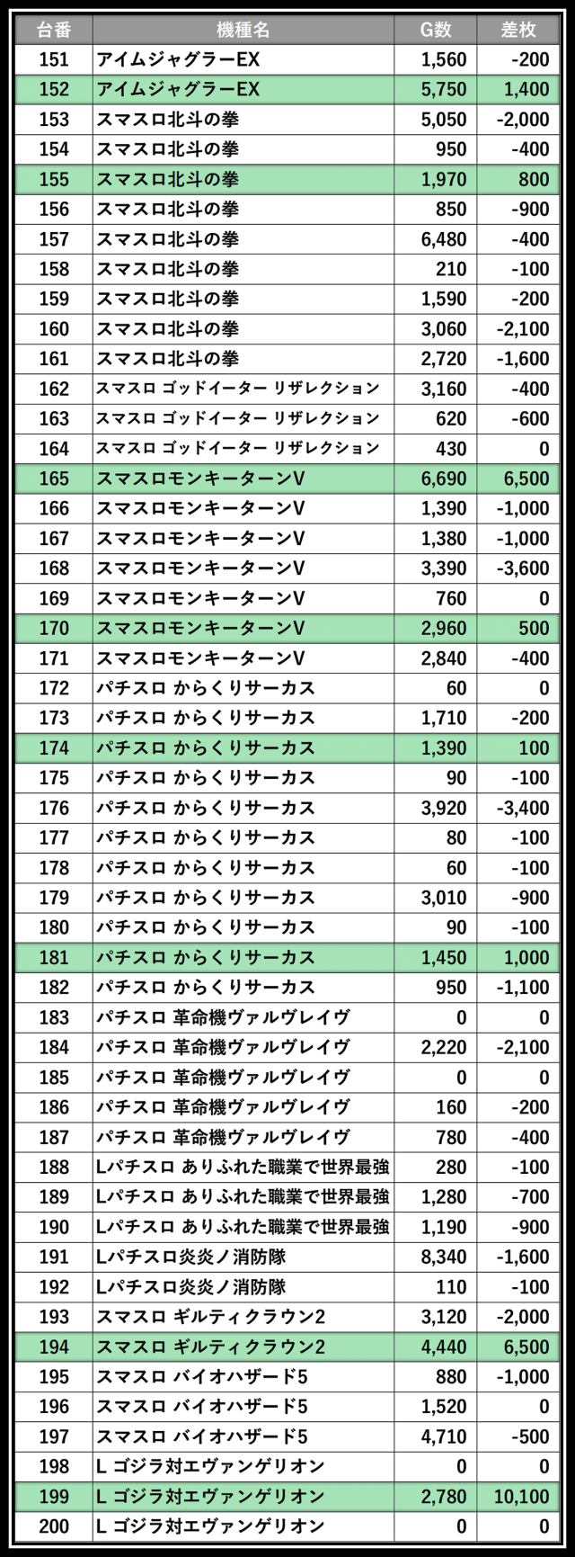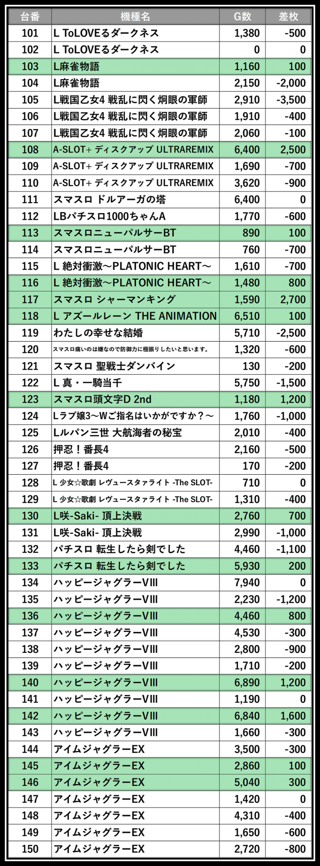 ※差枚数順に掲載しています