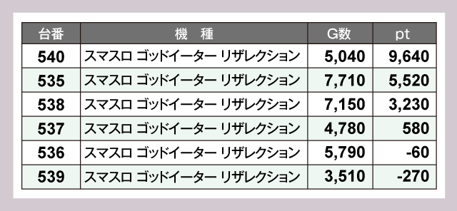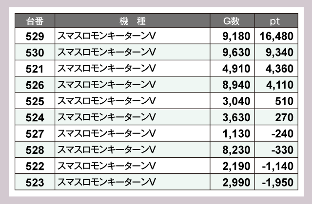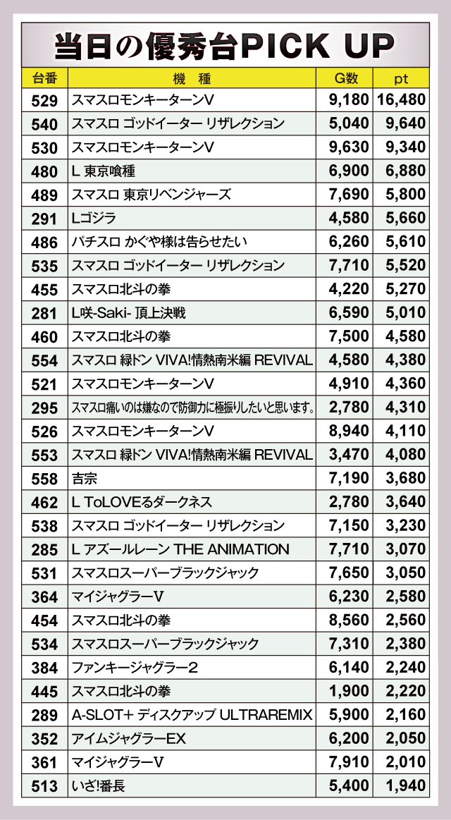 『スマスロモンキーターンV』529番台が+16,480ptと、誰もがうらやむ圧倒的な成績をおさめた。そして『スマスロ ゴッドイーター リザレクション』540番台が+9,640pt、『スマスロモンキーターンV』530番台が+9,340ptでつづく。他にも『L 東京喰種』480番台の+6,880pt、『スマスロ 東京リベンジャーズ』489番台の+5,800ptなどなど、素晴らしいptがズラリと並ぶ見事なデータを見せてくれた。