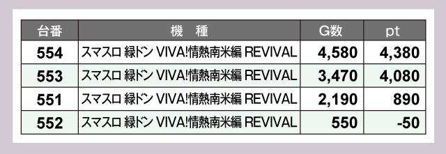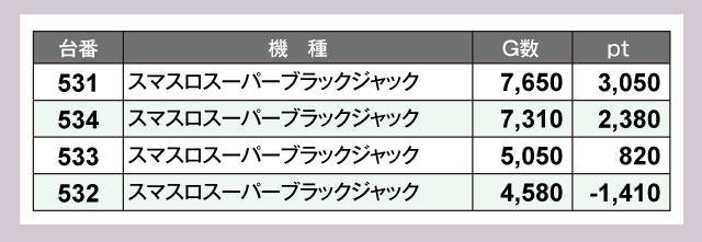 『スマスロスーパーブラックジャック』と『スマスロ 緑ドン VIVA!情熱南米編 REVIVAL』はどちらも4台中3台がプラスptで、G数がしっかり稼がれた台が結果をのこしている。