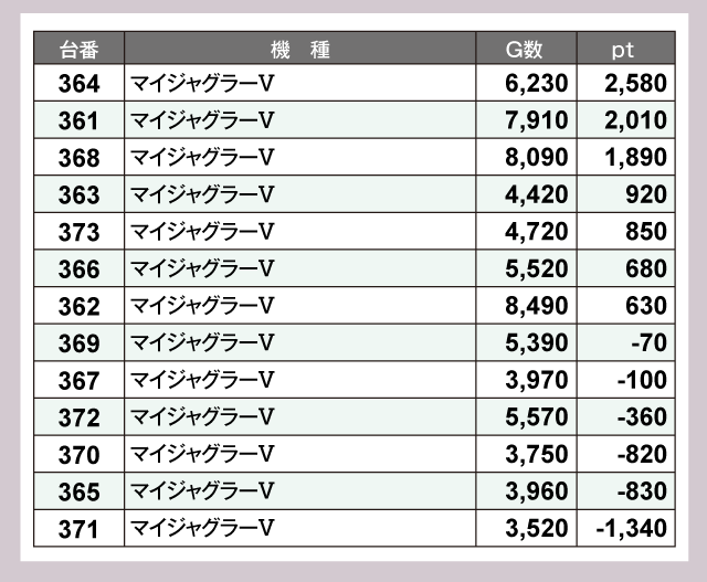 『ジャグラー』シリーズからは『マイジャグラーⅤ』をピックアップ。13台中7台がプラスとなっていて、バツグンの安定感を示していた。