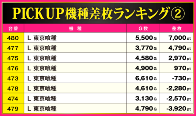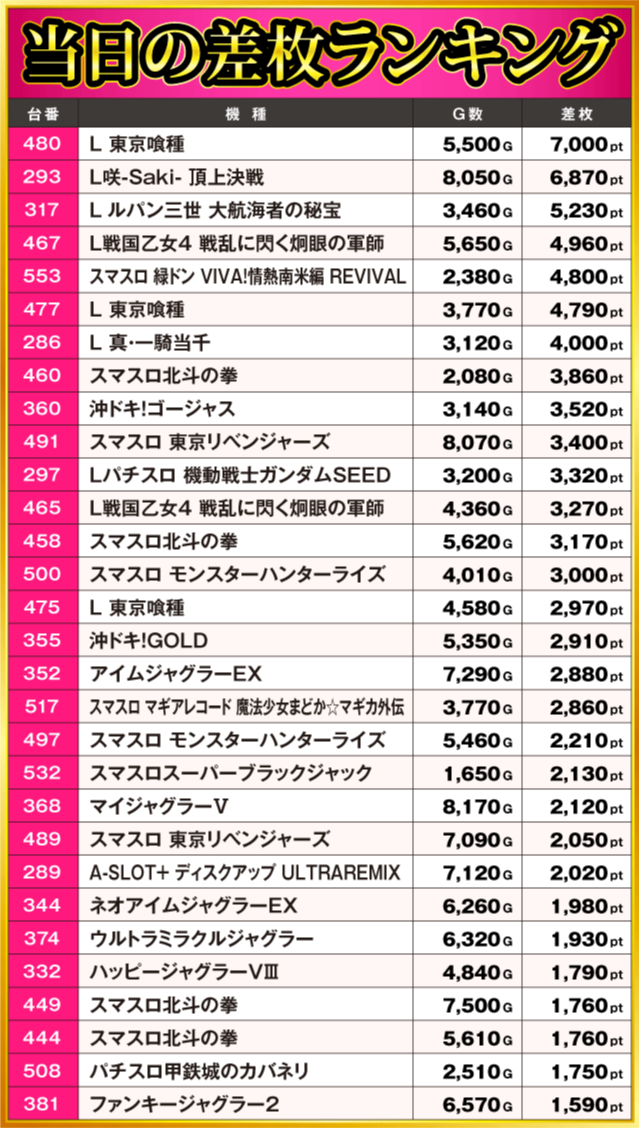 当日の差枚ランキング