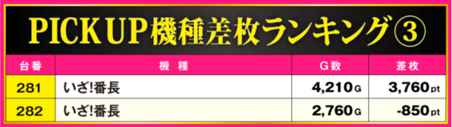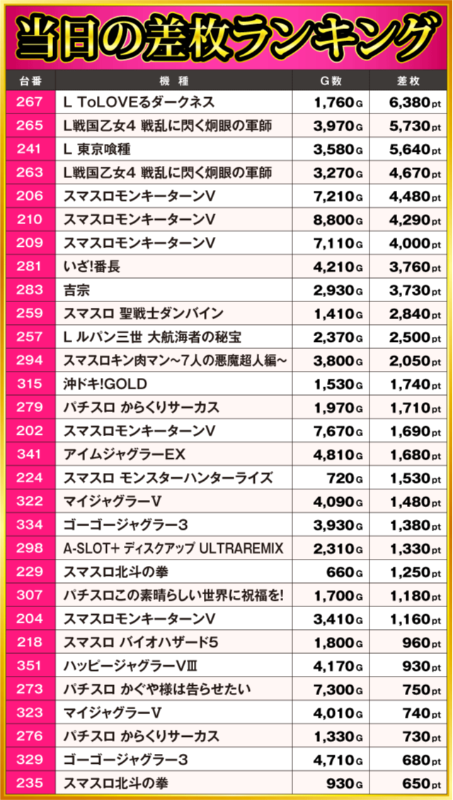 当日の差枚ランキング