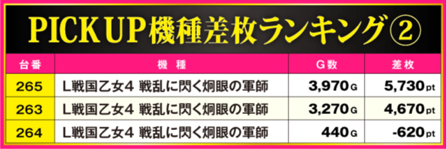 今回のPICK UP機種は全3機種。好成績が飛び出した『スマスロモンキーターンV』と『L戦国乙女4 戦乱に閃く炯眼の軍師』以外にも『いざ!番長』から+3,760ptが確認されている。さらに、最終的に3機種トータルの全15台中8台がプラス差枚となっているだけに、それぞれのシマは常に活気に満ち溢れる一日となった。