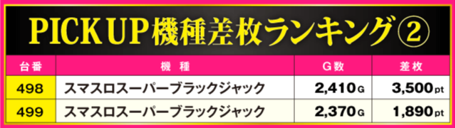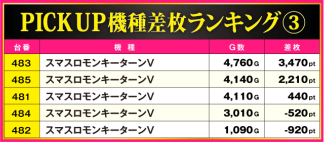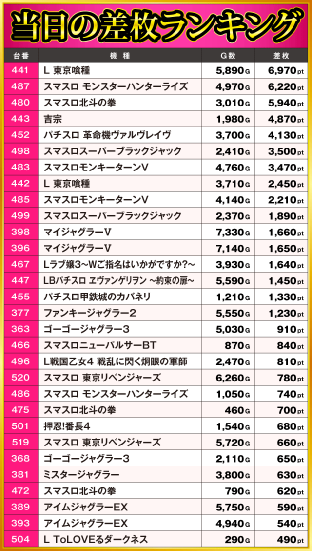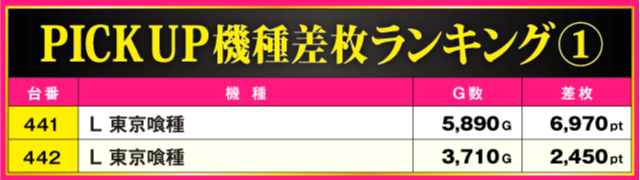 今回のPICK UP機種は全3機種で、差枚上位にランクインした『L 東京喰種』以外にも『スマスロスーパーブラックジャック』、『スマスロモンキーターンV』から+3,000pt超を確認。さらに、最終的に3機種トータルの全9台中7台がプラス差枚となっているだけに、ファンにとって充実の一日となったのは間違いないだろう。
